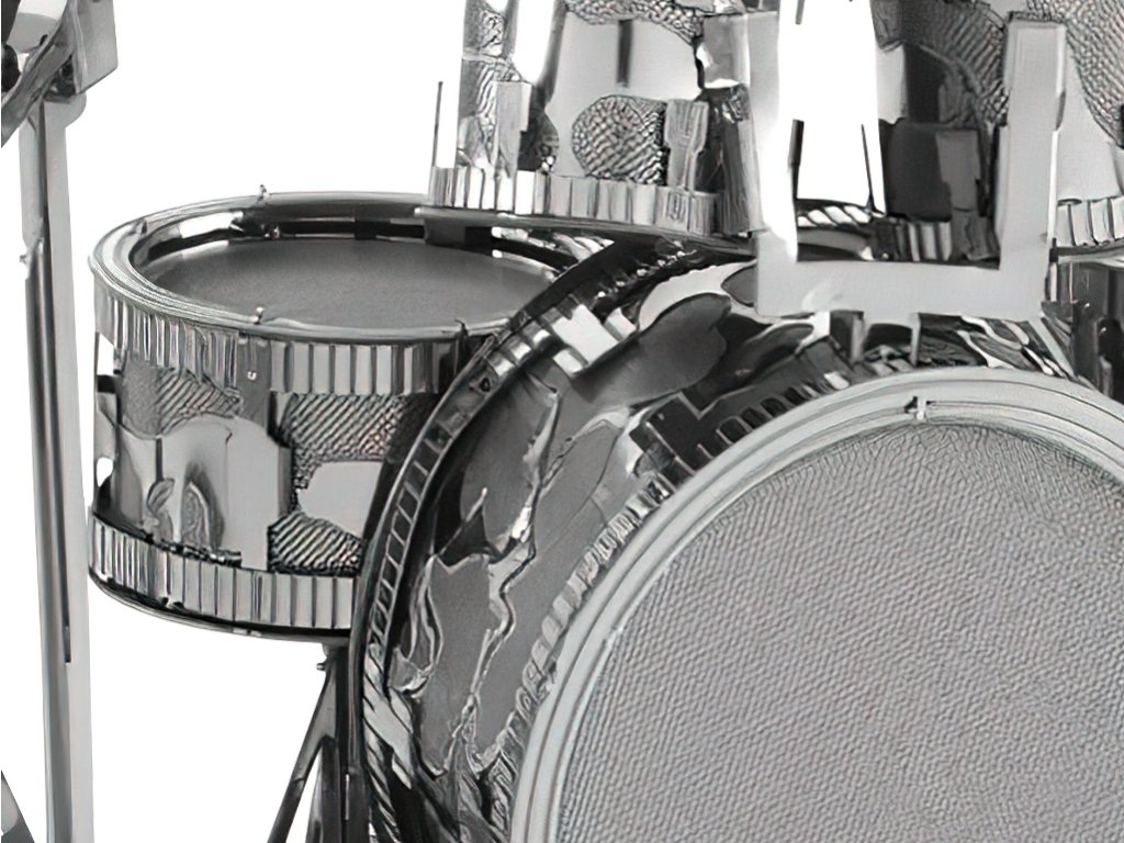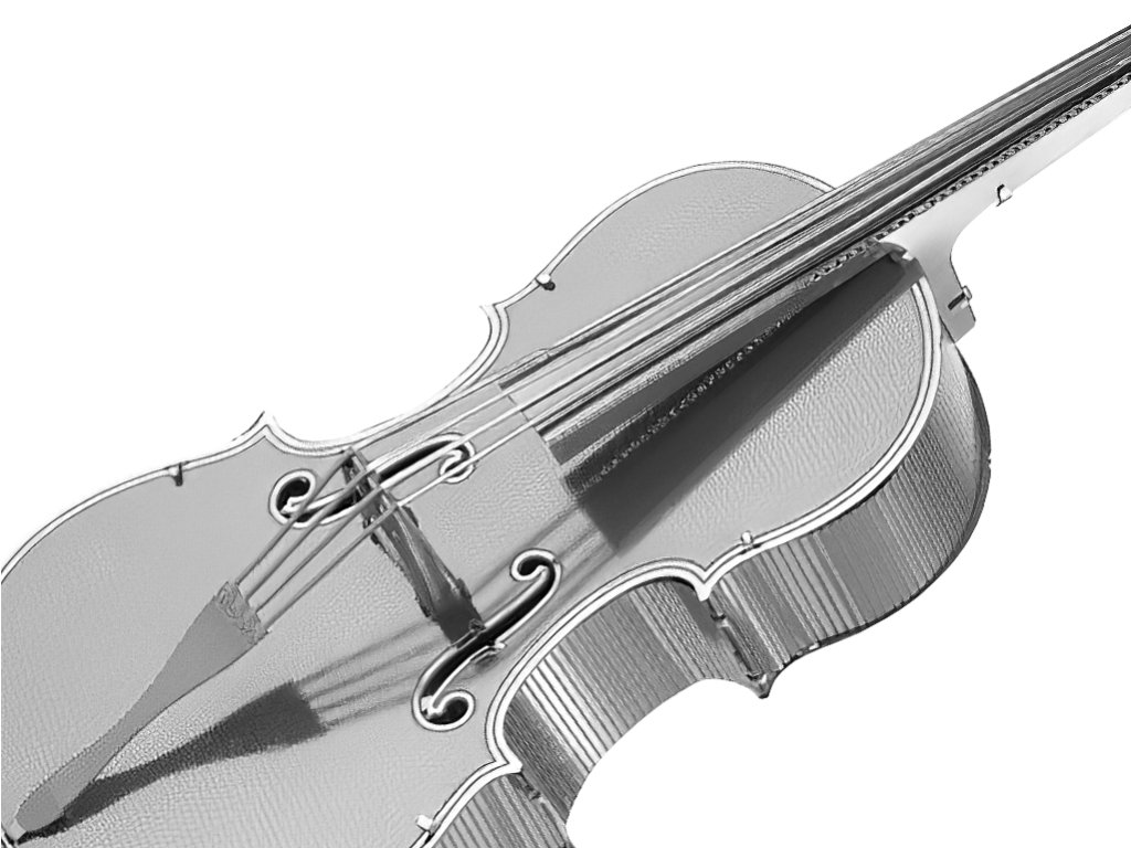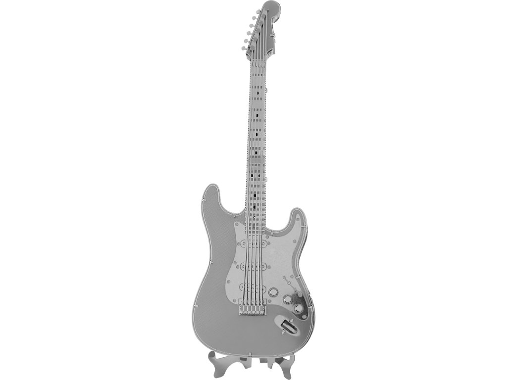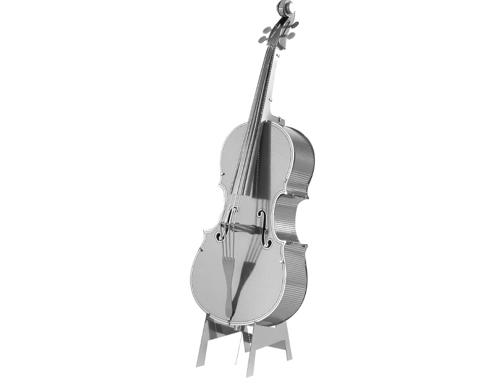 Kovová stavebnice ve tvaru hudebního nástroje ve stříbrné barvě.