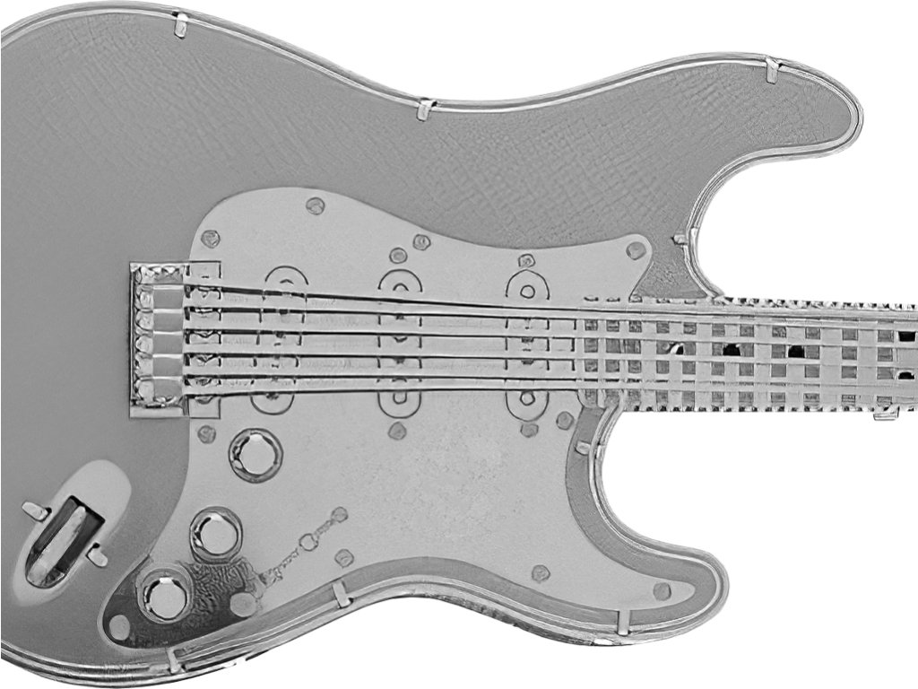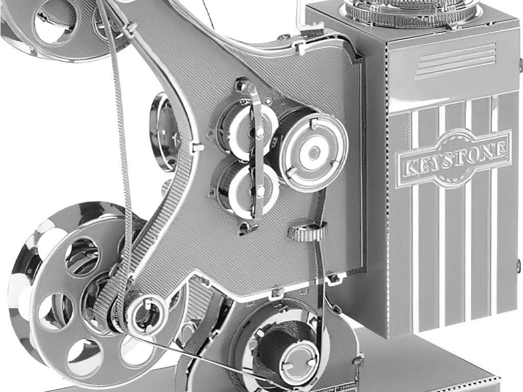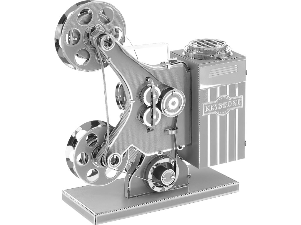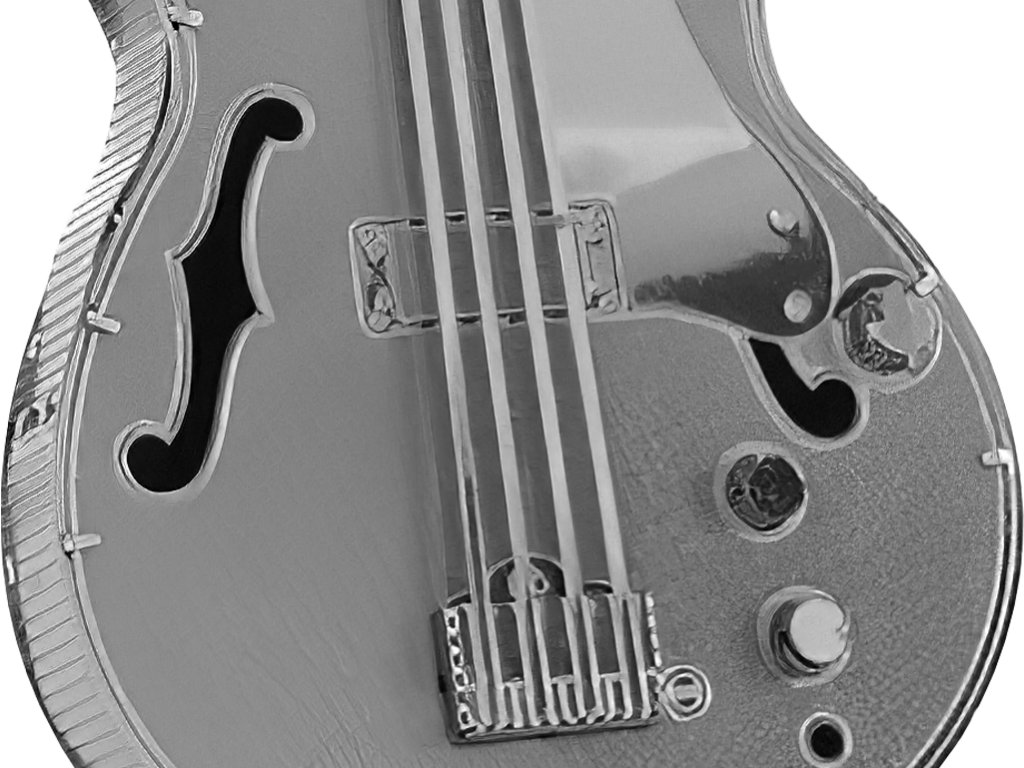 Kovová stavebnice ve tvaru hudebního nástroje ve stříbrné barvě.