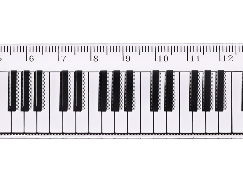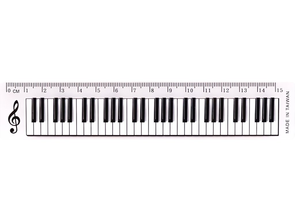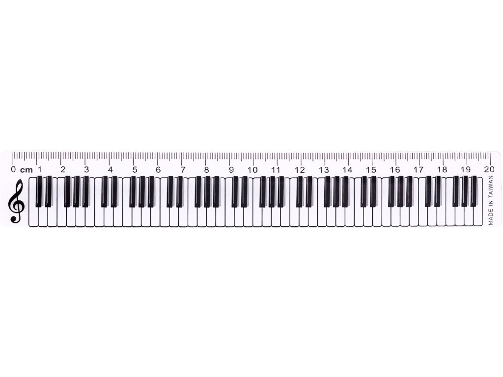 Černé/průhledné plastové pravítko dlouhé 15/20 cm s hudebním motivem bílé klaviatury.