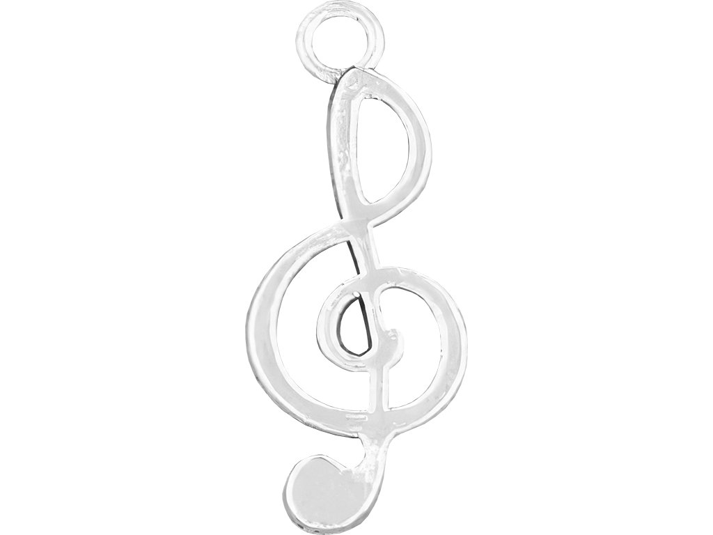 Kovový přívěsek ve tvaru klasického houslového klíče ve stříbrné barvě.