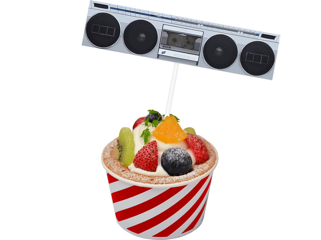 Papírový Boombox, rádio, kazeťák #9 je upevněn na plastové tyčce vysoké 7 cm – rozměr vlastního motivu je 13 cm x 3 cm.